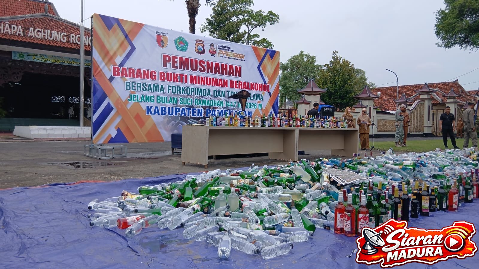 PAMEKASAN, SiaranMadura.com – Ribuan minuman keras (miras) berhasil diamankan aparat gabungan kepolisian dan Satuan Polisi Pamong Praja (Satpol PP) dari berbagai lokasi di Kabupaten Pamekasan. Barang bukti tersebut kemudian dimusnahkan di Lapangan Negara Bhakti, Senin (9/2/2026), menjelang bulan suci Ramadan.